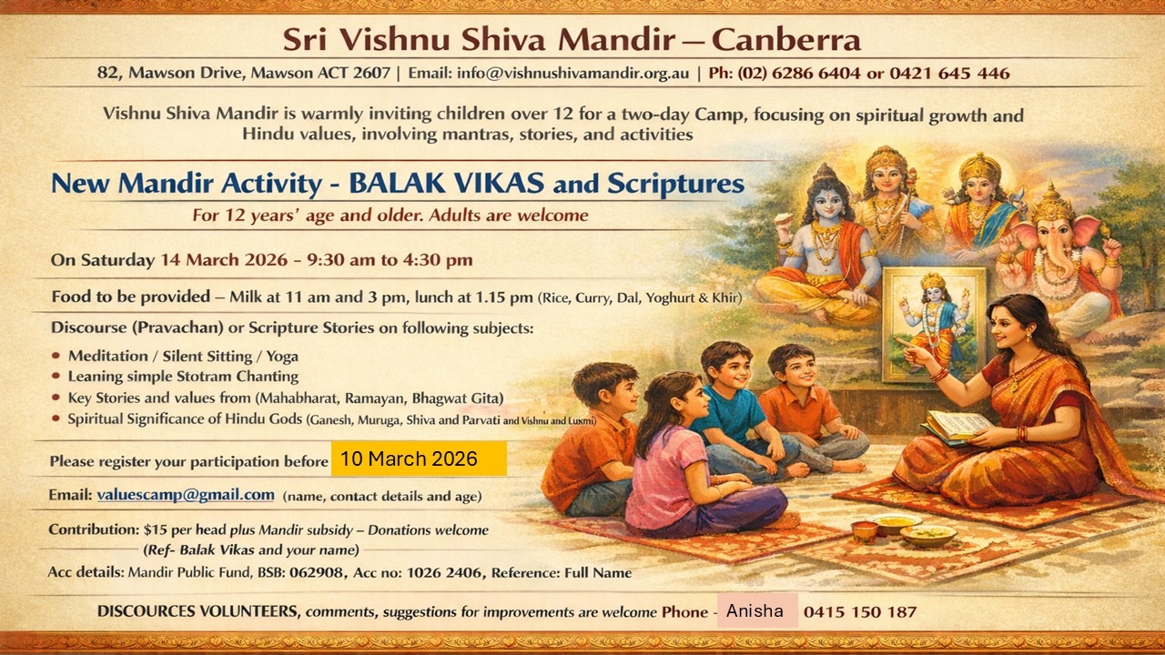 Finally, please come, pray, behold the deities, enjoy the Library, join a Yoga class, participate in celebrations, and experience an open mind and an elated spirit. Enrich your life by coming to the Mandir.